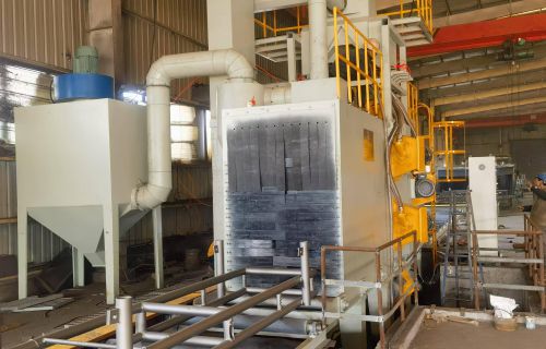 【現(xiàn)場安裝圖集】:簡介:吊鉤式拋丸機分為單吊鉤和雙吊鉤,拋丸機由吊鉤裝載工件交替進入拋丸清理室內(nèi)。利用拋...